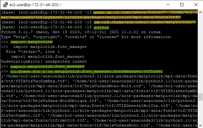 $ sudo cp -r /usr/share/fonts/* /home/ec2-user/anaconda3/lib/python3.11/site-packages/matplotlib/mpl-data/fonts/ttf/
