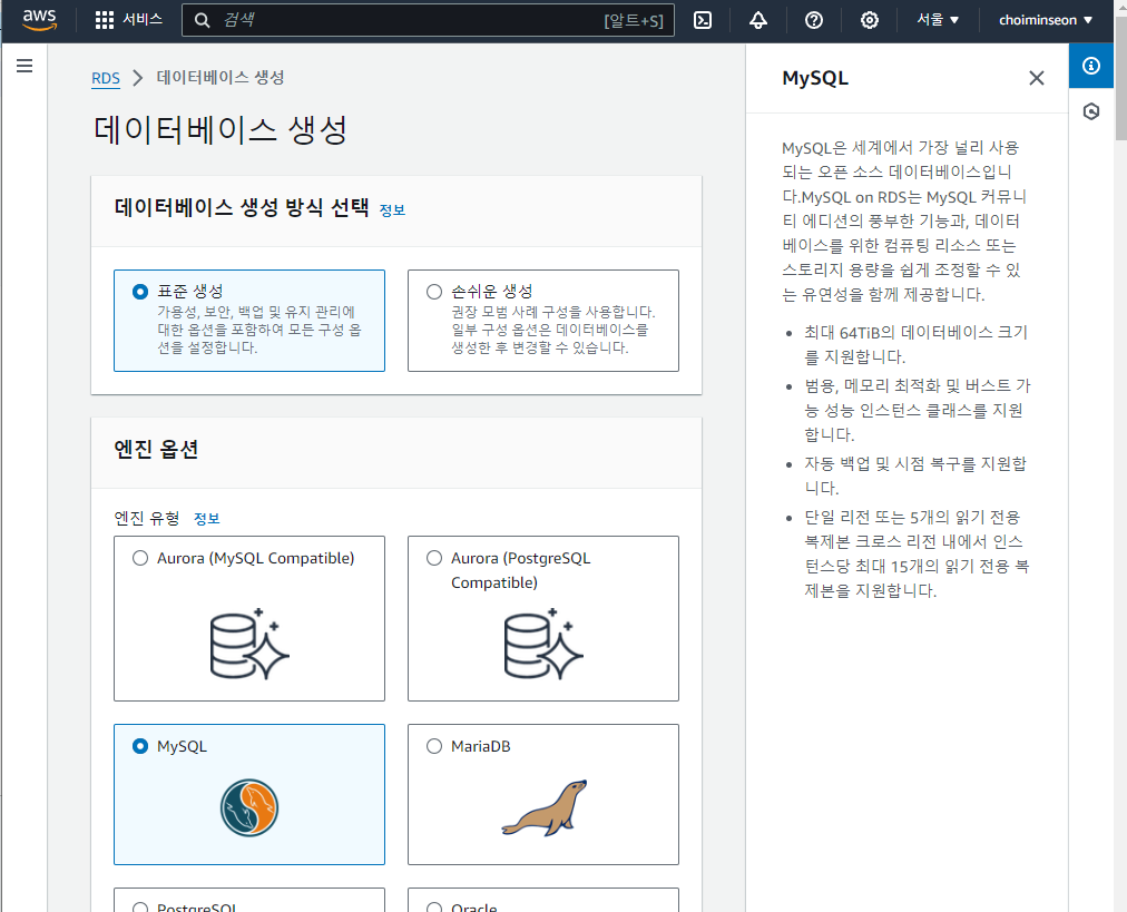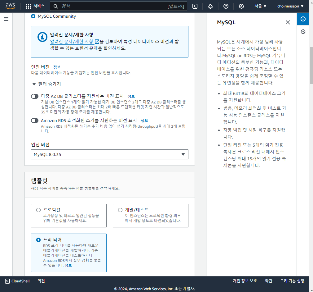 - MySQL은 프리티어가 있으므로 프리티어 선택