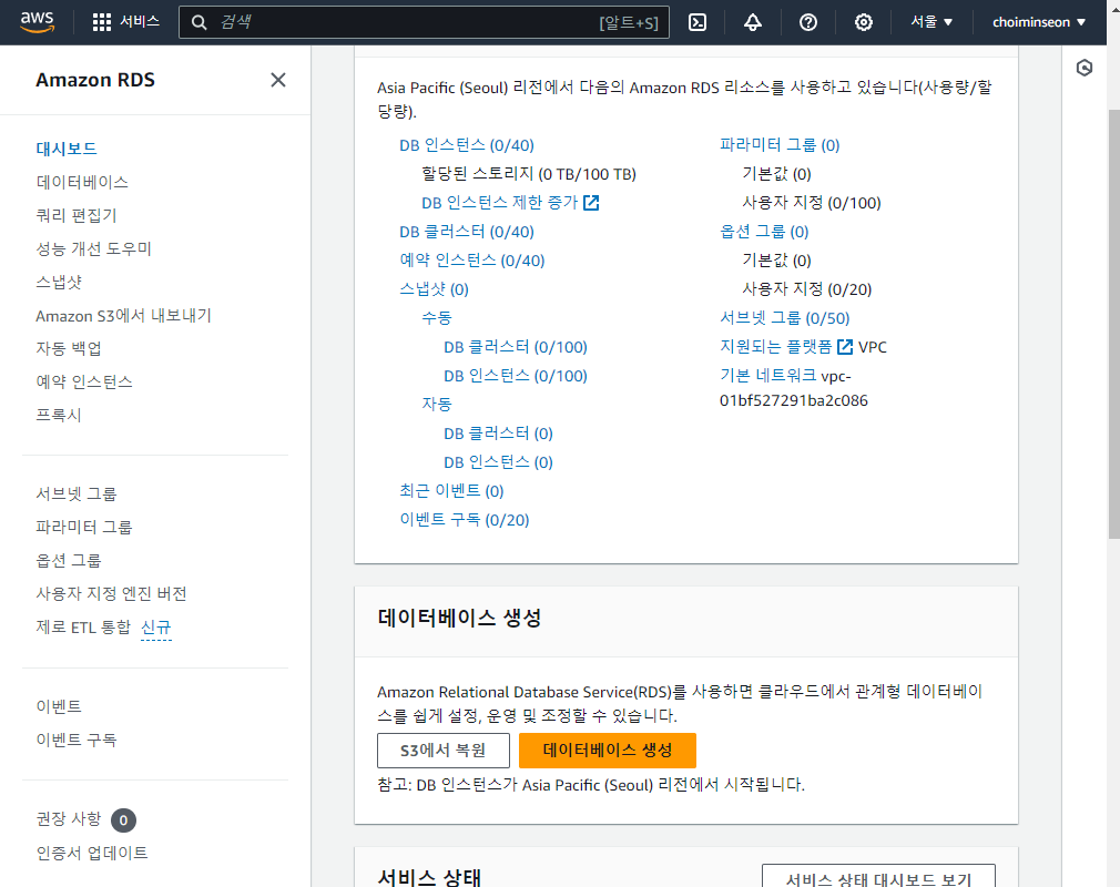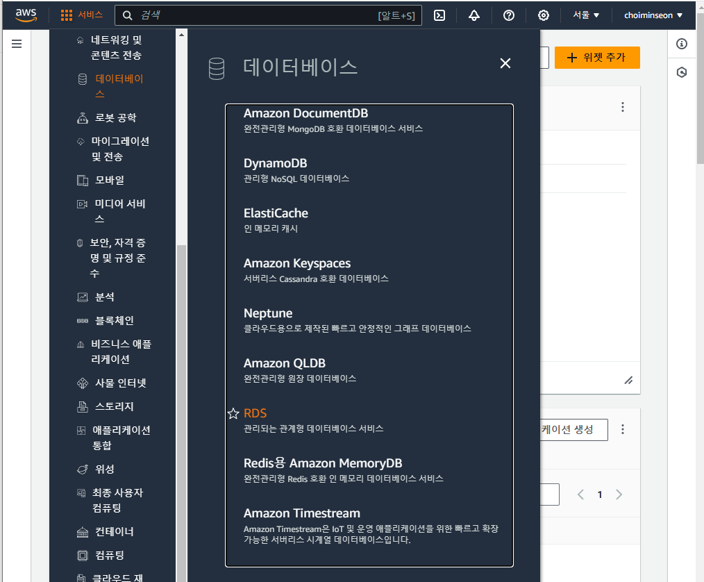 1. AWS 콘솔 홈에서 서비스 창안에 있는 데이터베이스 RDS 들어간다.