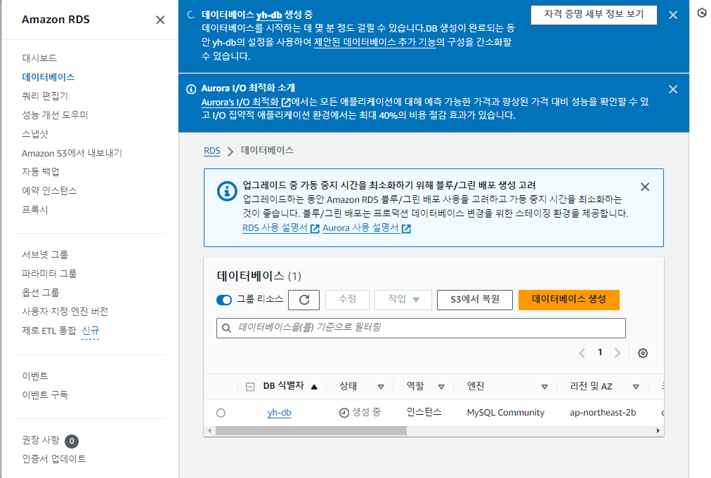 2. 리전(서울로 해야 실행 속도가 빠르다)을 확인하고, DB 생성하기