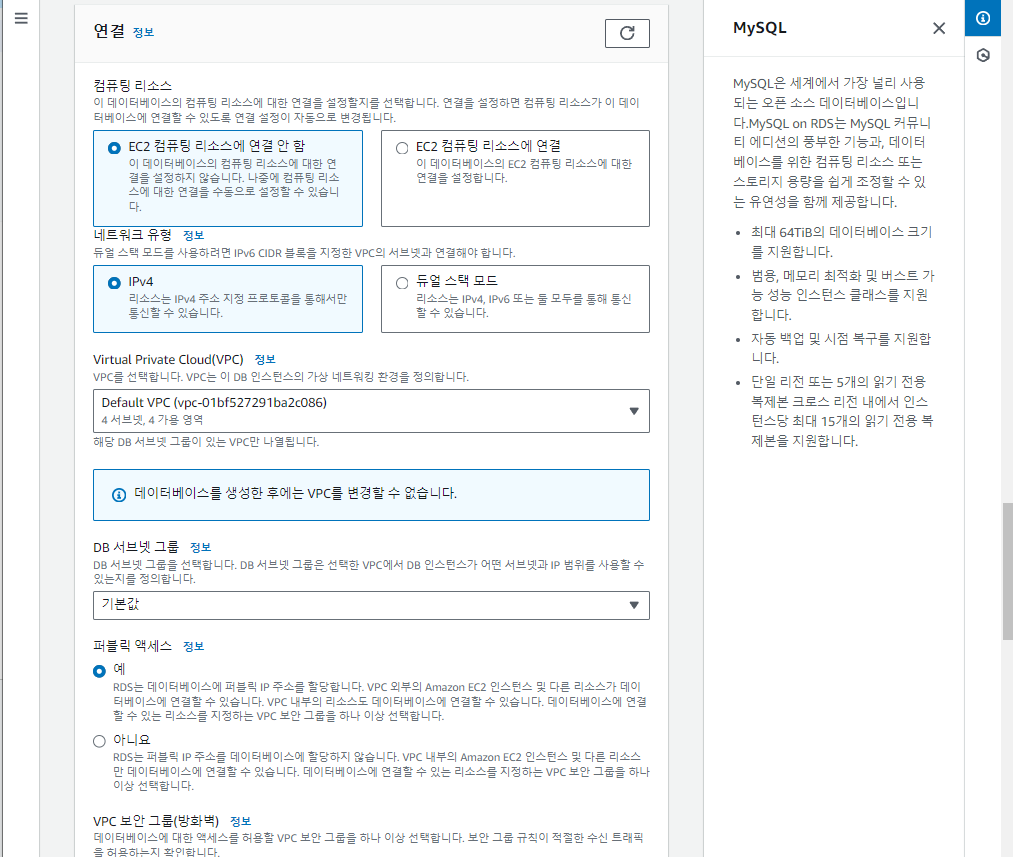 - 연결 - 퍼블릭 엑세스 가능하게 설정한다. (회사에서는 퍼블릭 엑세스 가능하게 안한다.)