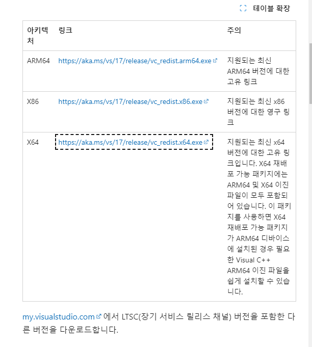 https://learn.microsoft.com/ko-KR/cpp/windows/latest-supported-vc-redist?view=msvc-170