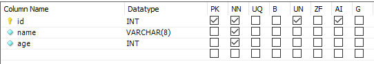 컬럼 이름 : id / Datatype : INT / 체크 : PK, NN, UN, AI