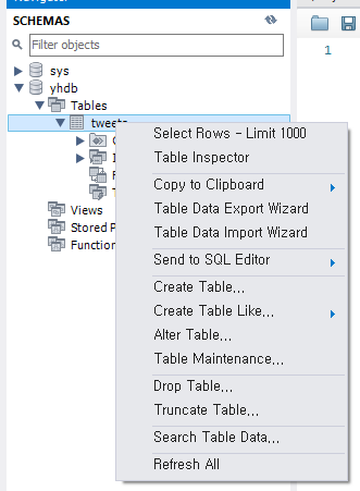 2. 만든 데이터베이스 Tables 폴더에 새로운 테이블 만들기