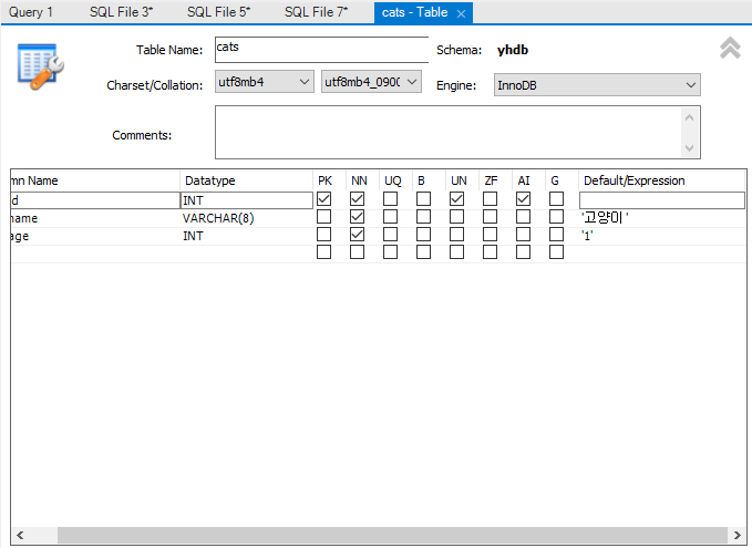 1. cats 테이블에 데이터 한 개 저장하기