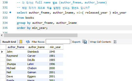 -- 각 작가의 full name 별로 (author_fnmae, author_lname)