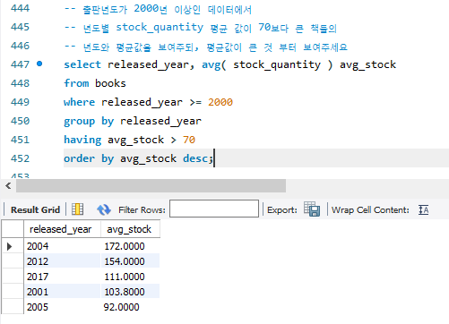 -- 년도별 stock_quantity 평균 값이 70보다 큰 책들의
