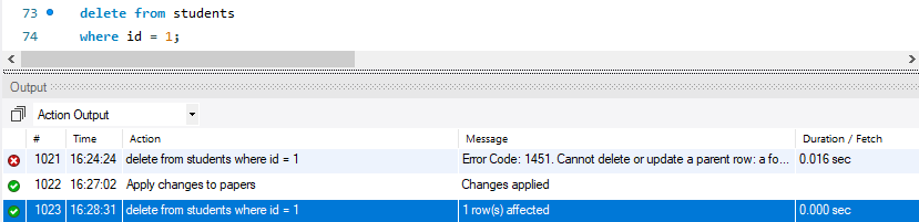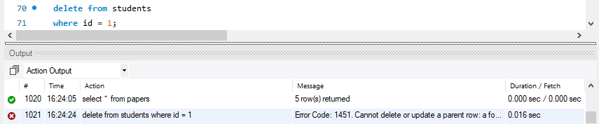 Error Code: 1451. Cannot delete or update a parent row: a foreign key constraint fails (`yhdb`.`papers`, CONSTRAINT `papers_student_id` FOREIGN KEY (`student_id`) REFERENCES `students` (`id`))
