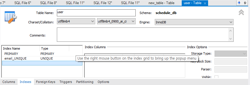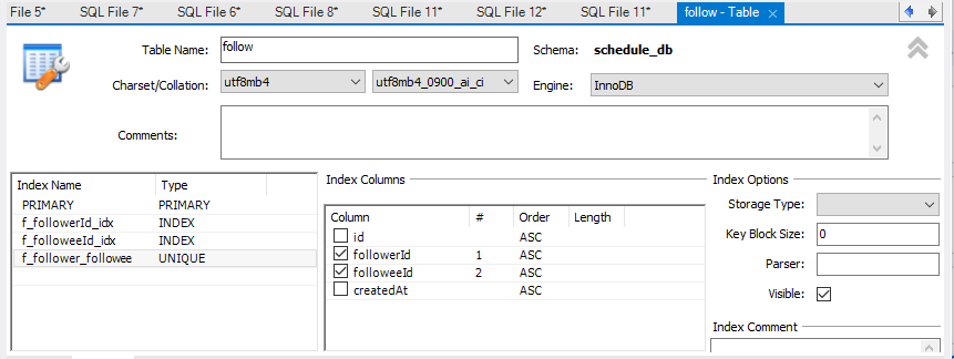 - 해당 테이블 생성하는 창 인덱스 탭에서 직접 설정해 준다. _ 유니크하게 이름을 작성해 주고 두 개의 값을 묶어서 설정한다.
