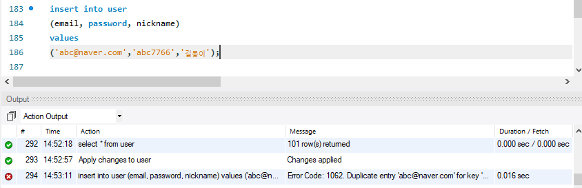 Error Code: 1062. Duplicate entry 'abc@naver.com' for key 'user.email_UNIQUE'