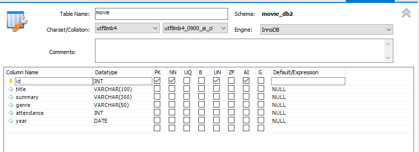 : id, 제목, 내용요약, 장르, 관객수, 개봉일( 시간정보는 없어서 DATE로 지정 )
