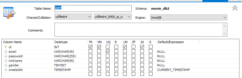 : id, 이메일(UQ 값으로 지정), 비밀번호, 닉네임, 가입날짜( Timestamp로 디폴트값 now() 설정 ) 컬럼 생성