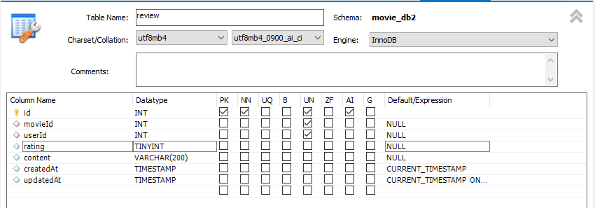 3. 영화의 리뷰 정보를 저장할 review 테이블 생성