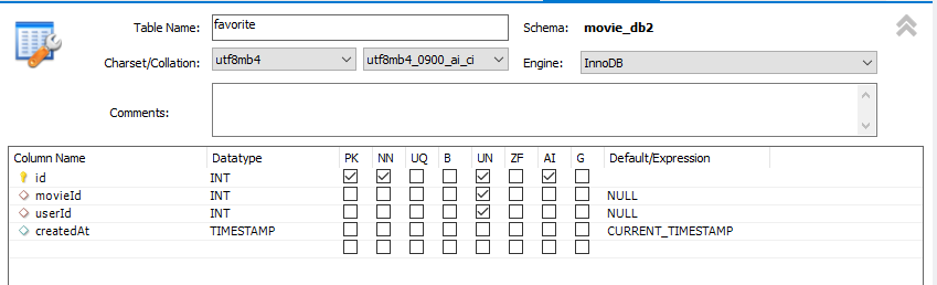 : id, 등록된 영화 id( Foreign Key ), 등록된 유저 id ( Foreign Key ), 생성날짜( Timestamp로 디폴트값 now() 설정 )