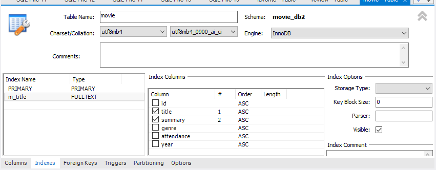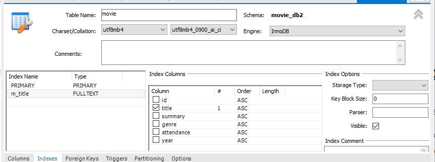 - 인데스 이름을 정하고 타입은 FULLTEXT을 선택하고 원하는 컬럼을 선택하면 된다.