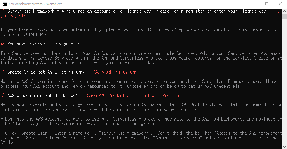 AWS IAM에서 생성한 유저로 서버리스에 엑세스 권한을 설정해 준다.
