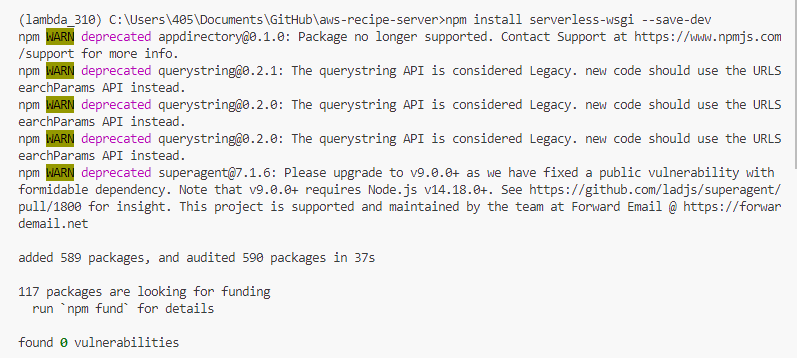 : $ npm install serverless-wsgi --save-dev <- 최신 버전