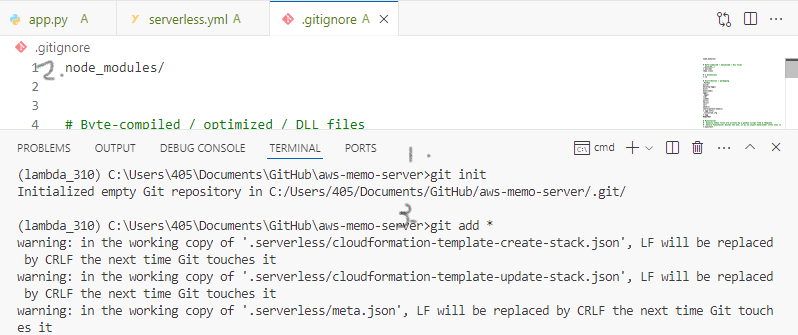 2. Github Desktop을 이용하지 않고 서버리스로 만든 VSCode 커맨드 터미널에서 github와 연결한다.
