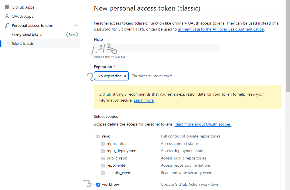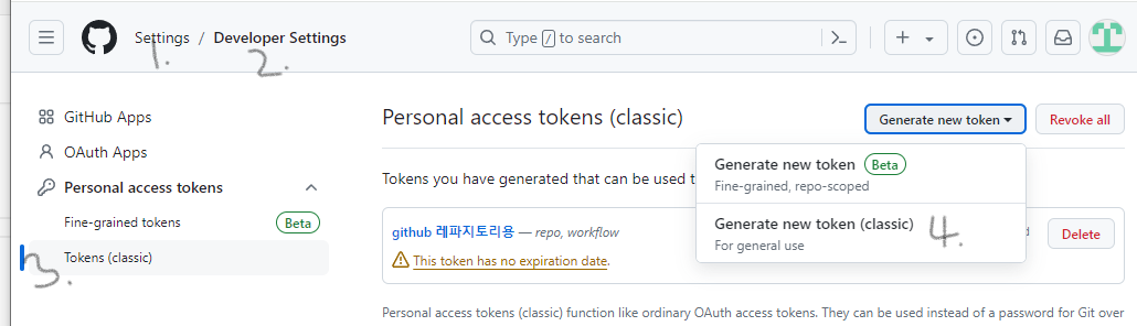 - 오류 발생 시 해결방법은 깃허브 토큰을 만들어서 코드를 다시 작성하면 된다.