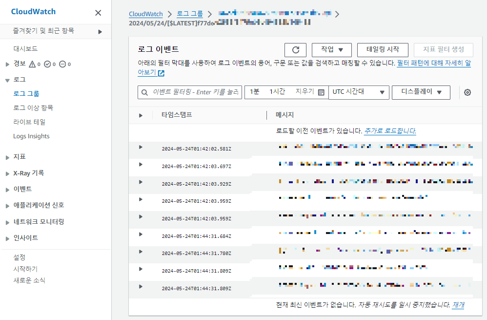 - 서비스 검색: CloudWatch -> 로그그룹 -> 내가 보고 싶은 서버 선택 -> 로그 스트림 확인하기