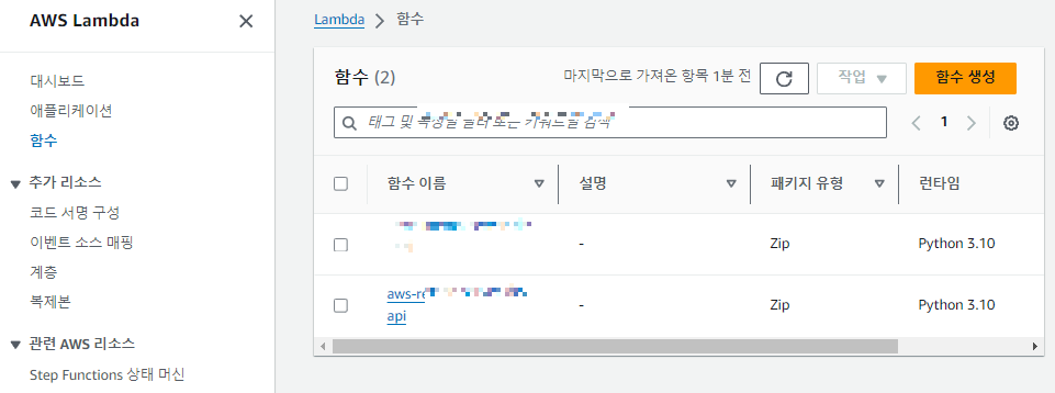 - 서비스 -> 컴퓨팅 -> Lambda 들어가면, 내가 만든 서버가 보인다.