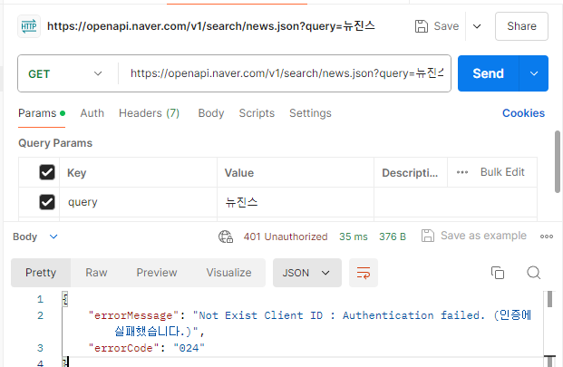 2. openAPI 에서 제공하는 정보로 검색 API가 제대로 작동하는지 Postman에서 확인한다.
