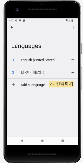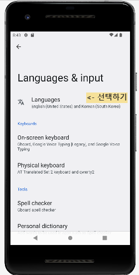 2. Language & input 한번 더 선택하고 Languages 선택 -> + Add a language 선택해서 한국어 찾기
