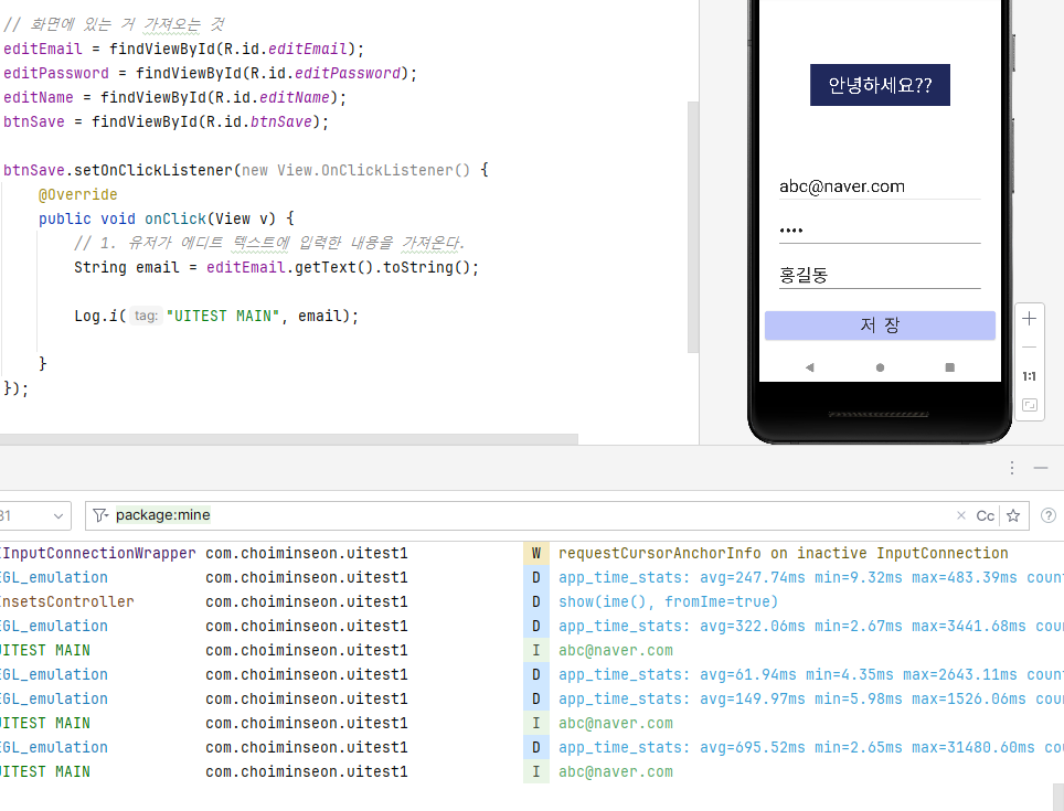 유저한테 입력받는 EditText를 만들었는데 유저한테 입력받은 값이 잘 오는지 로그로 확인하려고 한다.