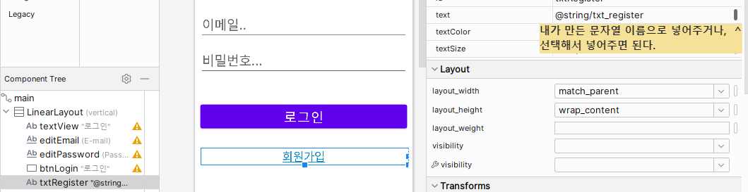 - 화면 구성하는 곳에서 text 입력하는 부분에 설정한 문자열을 넣어주면 된다.