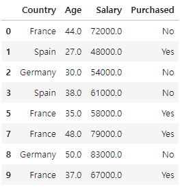 9	France	37.0	67000.0	Yes- 2. 채우는 방법 _데이터프레임의 숫자(numeric_only=True)만 평균(mean())으로 계산하여 채웠다