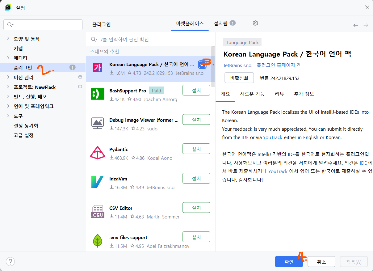 - 설정의 플러그인(Plugins)의 언어팩 체크를 없애고 확인(apply)을 누르면 된다.