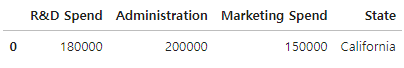 new_data = pd.DataFrame({'R&D Spend':[180000],