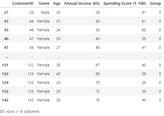 - 인공지능을 만들어 군집을 형성하고 기초 데이터셋에 'Group'이라는 컬럼명으로 추가한다