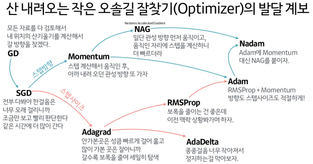 - Optimizer란 loss function을 통해 구한 차이를 사용해 기울기를 구하고