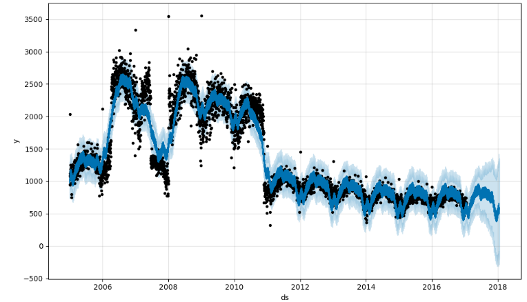 - 프로펫 라이브러리를 사용하려면, 날짜 컬럼은 'ds' 로, 에측하려는 수치는 'y'로 바꿔야한다