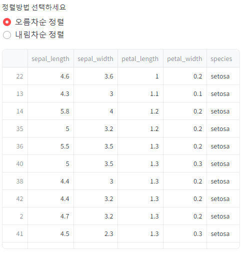 status = st.radio(label='정렬방법 선택하세요', options = my_order)
